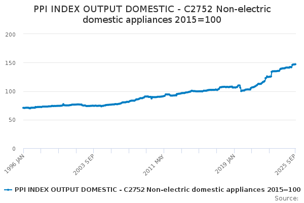 Download this time seriesPPI INDEX OUTPUT DOMESTIC - C2752 Non-electric domestic appliances 2015=100