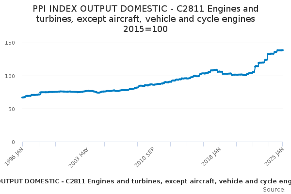 Download this time seriesPPI INDEX OUTPUT DOMESTIC - C2811 Engines and turbines, except aircraft, vehicle and cycle engines 2015=100