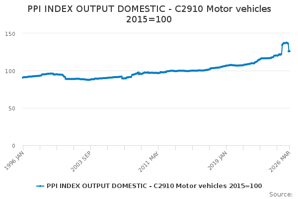 Download this time seriesPPI INDEX OUTPUT DOMESTIC - C2910 Motor vehicles 2015=100