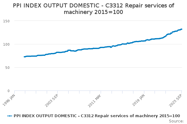 Download this time seriesPPI INDEX OUTPUT DOMESTIC - C3312 Repair services of machinery 2015=100