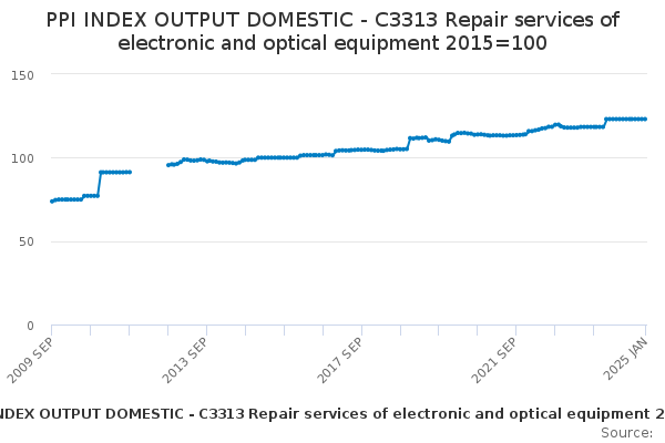 Download this time seriesPPI INDEX OUTPUT DOMESTIC - C3313 Repair services of electronic and optical equipment 2015=100