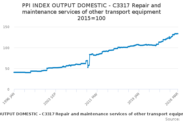 Download this time seriesPPI INDEX OUTPUT DOMESTIC - C3317 Repair and maintenance services of other transport equipment 2015=100