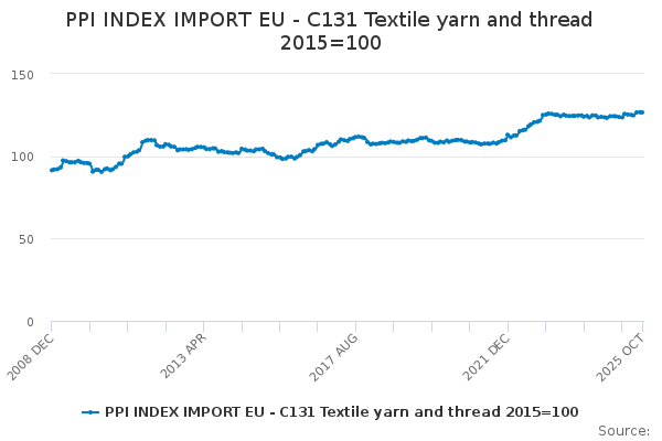 Download this time seriesPPI INDEX IMPORT EU - C131 Textile yarn and thread 2015=100