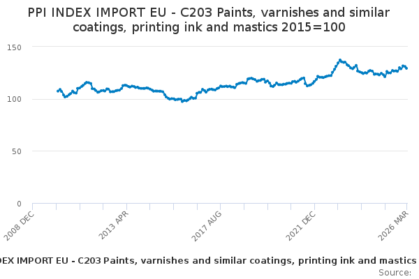 Download this time seriesPPI INDEX IMPORT EU - C203 Paints, varnishes and similar coatings, printing ink and mastics 2015=100
