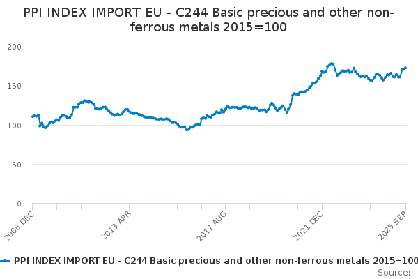 Download this time seriesPPI INDEX IMPORT EU - C244 Basic precious and other non-ferrous metals 2015=100