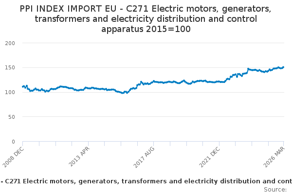 Download this time seriesPPI INDEX IMPORT EU - C271 Electric motors, generators, transformers and electricity distribution and control apparatus 2015=100