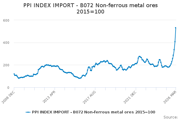 Download this time seriesPPI INDEX IMPORT - B072 Non-ferrous metal ores 2015=100