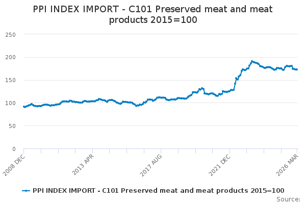 Download this time seriesPPI INDEX IMPORT - C101 Preserved meat and meat products 2015=100