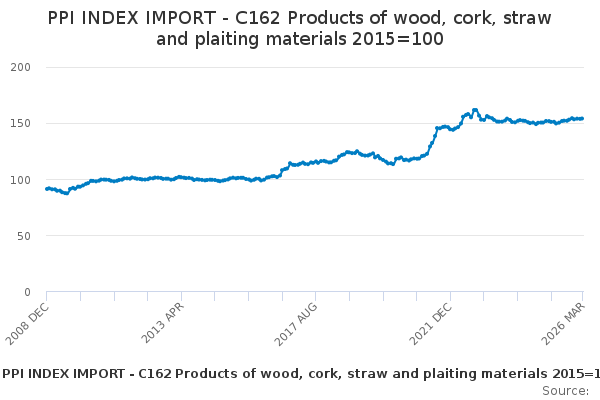 Download this time seriesPPI INDEX IMPORT - C162 Products of wood, cork, straw and plaiting materials 2015=100
