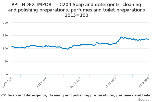 Download this time seriesPPI INDEX IMPORT - C204 Soap and detergents, cleaning and polishing preparations, perfumes and toilet preparations 2015=100