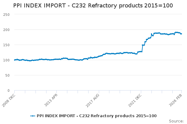 Download this time seriesPPI INDEX IMPORT - C232 Refractory products 2015=100
