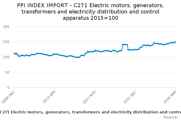 Download this time seriesPPI INDEX IMPORT - C271 Electric motors, generators, transformers and electricity distribution and control apparatus 2015=100