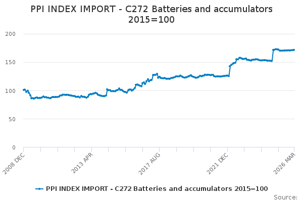 Download this time seriesPPI INDEX IMPORT - C272 Batteries and accumulators 2015=100