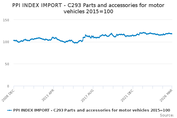 Download this time seriesPPI INDEX IMPORT - C293 Parts and accessories for motor vehicles 2015=100