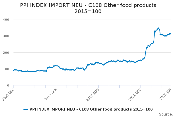 Download this time seriesPPI INDEX IMPORT NEU - C108 Other food products 2015=100
