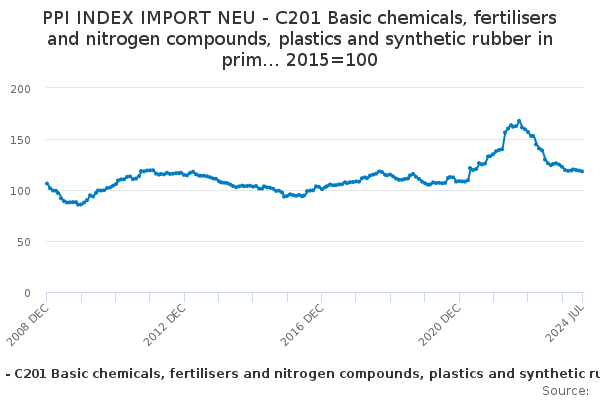 Download this time seriesPPI INDEX IMPORT NEU - C201 Basic chemicals, fertilisers and nitrogen compounds, plastics and synthetic rubber in prim... 2015=100