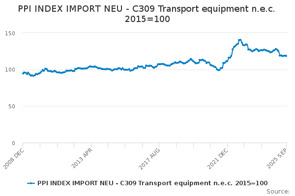 Download this time seriesPPI INDEX IMPORT NEU - C309 Transport equipment n.e.c. 2015=100