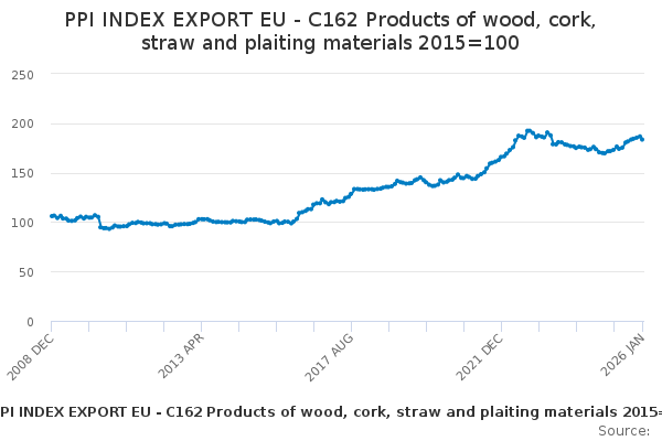 Download this time seriesPPI INDEX EXPORT EU - C162 Products of wood, cork, straw and plaiting materials 2015=100