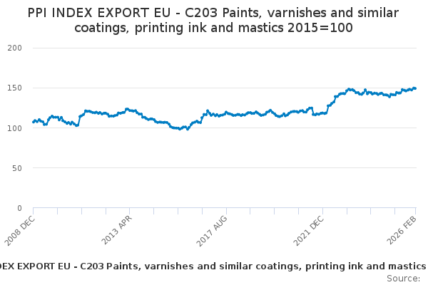 Download this time seriesPPI INDEX EXPORT EU - C203 Paints, varnishes and similar coatings, printing ink and mastics 2015=100