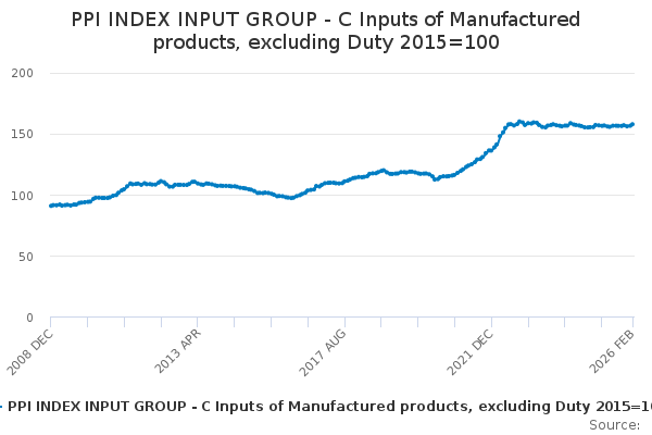 Download this time seriesPPI INDEX INPUT GROUP - C Inputs of Manufactured products, excluding Duty 2015=100
