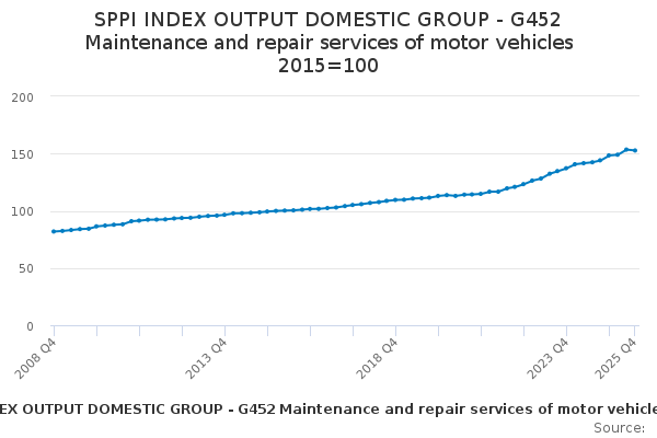 Download this time seriesSPPI INDEX OUTPUT DOMESTIC GROUP - G452 Maintenance and repair services of motor vehicles 2015=100