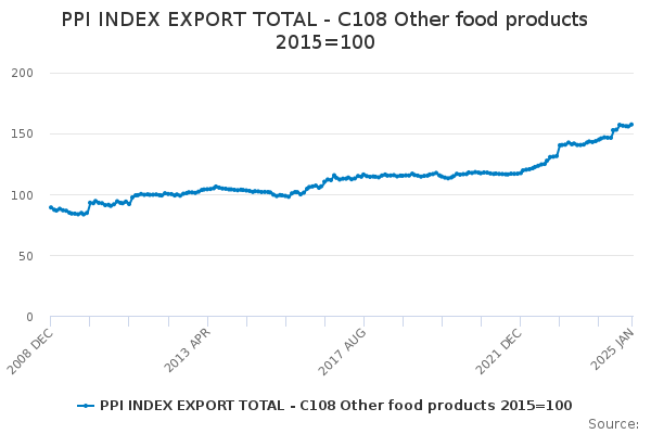 Download this time seriesPPI INDEX EXPORT TOTAL - C108 Other food products 2015=100