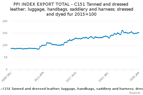 Download this time seriesPPI INDEX EXPORT TOTAL - C151 Tanned and dressed leather; luggage, handbags, saddlery and harness; dressed and dyed fur 2015=100