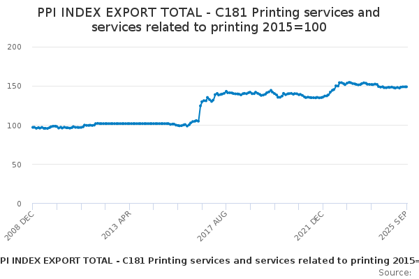 Download this time seriesPPI INDEX EXPORT TOTAL - C181 Printing services and services related to printing 2015=100