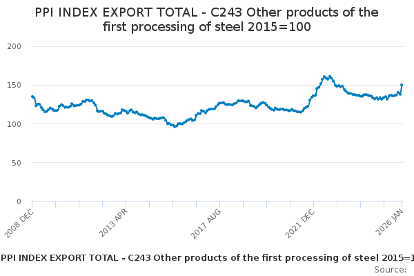 Download this time seriesPPI INDEX EXPORT TOTAL - C243 Other products of the first processing of steel 2015=100