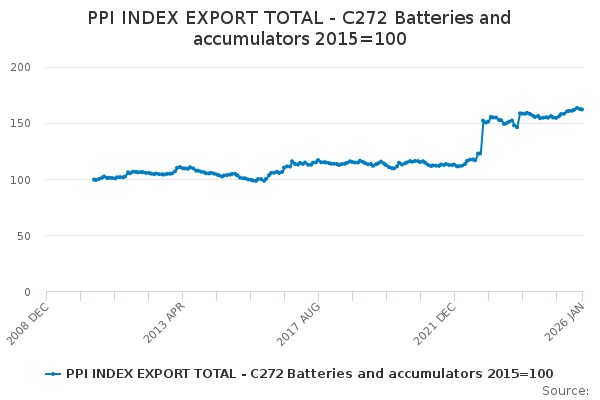 Download this time seriesPPI INDEX EXPORT TOTAL - C272 Batteries and accumulators 2015=100
