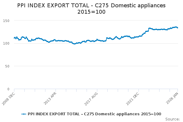 Download this time seriesPPI INDEX EXPORT TOTAL - C275 Domestic appliances 2015=100