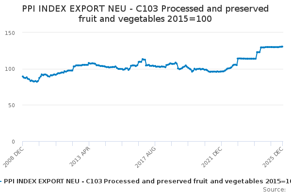 Download this time seriesPPI INDEX EXPORT NEU - C103 Processed and preserved fruit and vegetables 2015=100