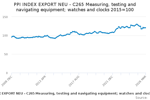 Download this time seriesPPI INDEX EXPORT NEU - C265 Measuring, testing and navigating equipment; watches and clocks 2015=100