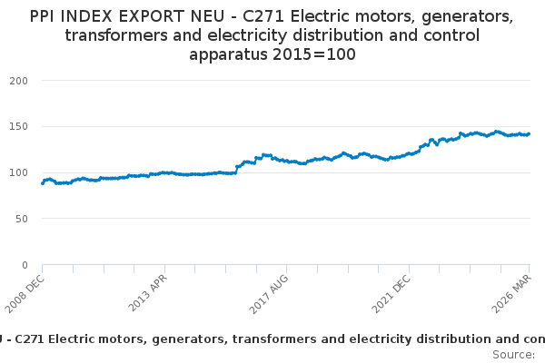 Download this time seriesPPI INDEX EXPORT NEU - C271 Electric motors, generators, transformers and electricity distribution and control apparatus 2015=100
