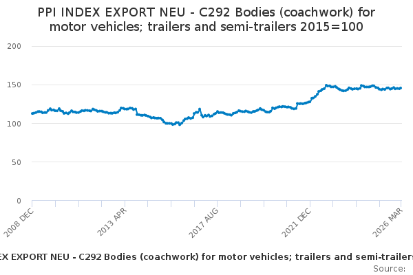 Download this time seriesPPI INDEX EXPORT NEU - C292 Bodies (coachwork) for motor vehicles; trailers and semi-trailers 2015=100