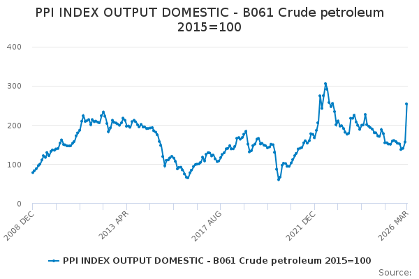 Download this time seriesPPI INDEX OUTPUT DOMESTIC - B061 Crude petroleum 2015=100