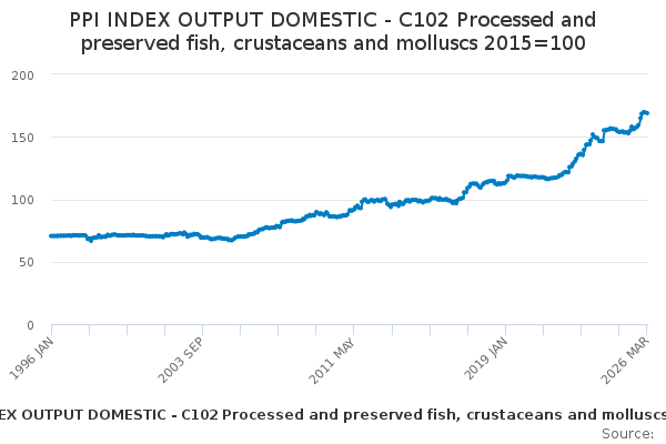 Download this time seriesPPI INDEX OUTPUT DOMESTIC - C102 Processed and preserved fish, crustaceans and molluscs 2015=100