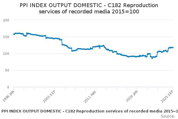 Download this time seriesPPI INDEX OUTPUT DOMESTIC - C182 Reproduction services of recorded media 2015=100