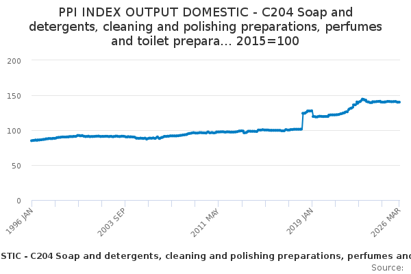 Download this time seriesPPI INDEX OUTPUT DOMESTIC - C204 Soap and detergents, cleaning and polishing preparations, perfumes and toilet prepara... 2015=100