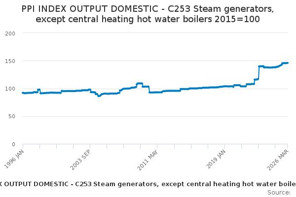 Download this time seriesPPI INDEX OUTPUT DOMESTIC - C253 Steam generators, except central heating hot water boilers 2015=100