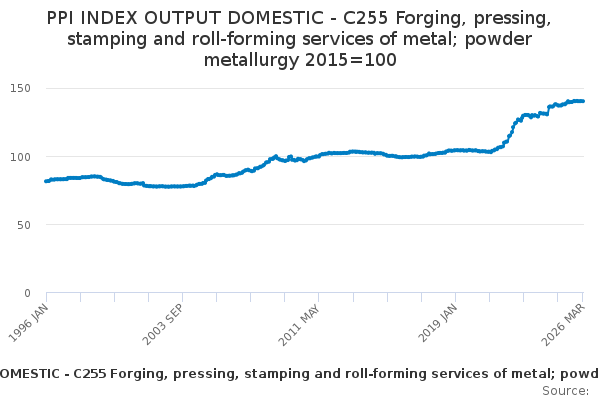 Download this time seriesPPI INDEX OUTPUT DOMESTIC - C255 Forging, pressing, stamping and roll-forming services of metal; powder metallurgy 2015=100