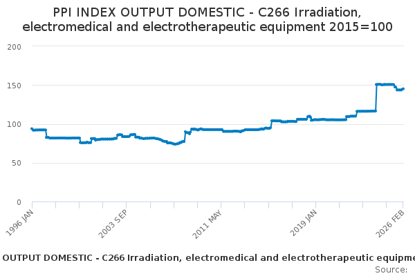 Download this time seriesPPI INDEX OUTPUT DOMESTIC - C266 Irradiation, electromedical and electrotherapeutic equipment 2015=100