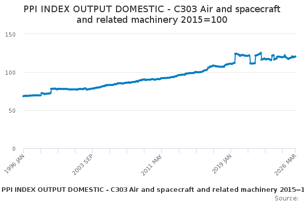 Download this time seriesPPI INDEX OUTPUT DOMESTIC - C303 Air and spacecraft and related machinery 2015=100