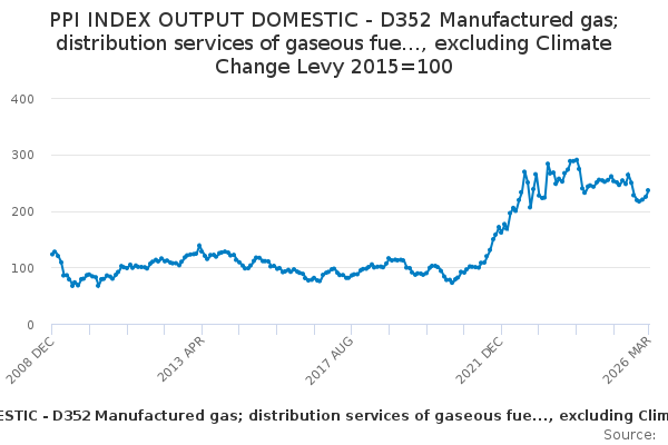 Download this time seriesPPI INDEX OUTPUT DOMESTIC - D352 Manufactured gas; distribution services of gaseous fue..., excluding Climate Change Levy 2015=100