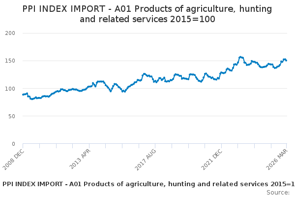 Download this time seriesPPI INDEX IMPORT - A01 Products of agriculture, hunting and related services 2015=100