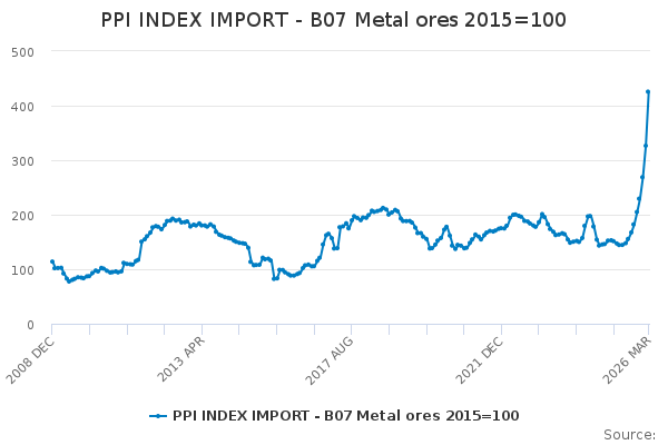 Download this time seriesPPI INDEX IMPORT - B07 Metal ores 2015=100