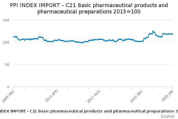 Download this time seriesPPI INDEX IMPORT - C21 Basic pharmaceutical products and pharmaceutical preparations 2015=100