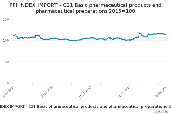 Download this time seriesPPI INDEX IMPORT - C21 Basic pharmaceutical products and pharmaceutical preparations 2015=100