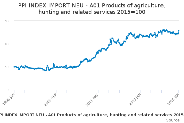 Download this time seriesPPI INDEX IMPORT NEU - A01 Products of agriculture, hunting and related services 2015=100
