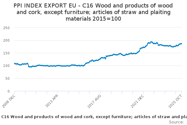 Download this time seriesPPI INDEX EXPORT EU - C16 Wood and products of wood and cork, except furniture; articles of straw and plaiting materials 2015=100